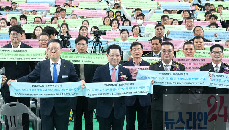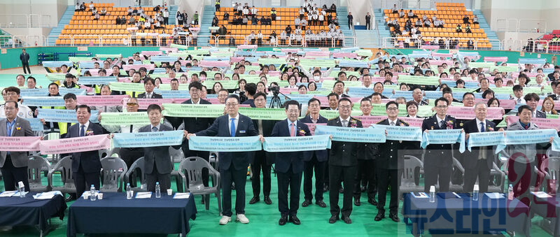 김영록 전라남도지사가 23일 화순 하니움 실내체육관에서 열린 ‘전남자율방범연합회 직무 경진대회’에서 참석자들과 기념촬영을 하고 있다.