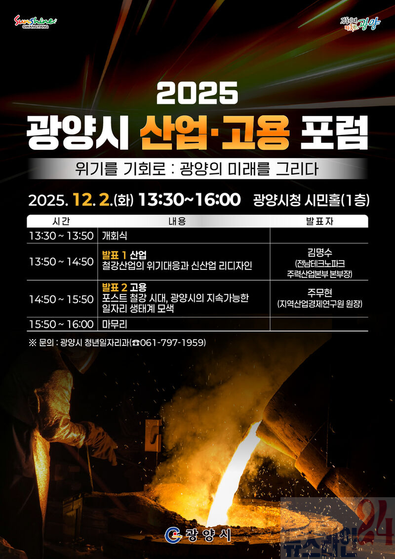 광양시는 오는 12월 2일(화) 오후 1시 30분, 시청 시민홀에서 ‘2025 광양시 산업‧고용 포럼’을 개최한다고 밝혔다.