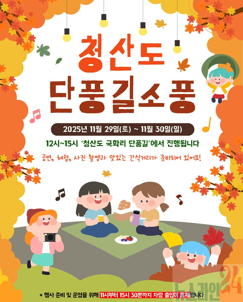 행사는 11월 29일과 30일 오후 12시부터 15시까지 진행되며, 29일에는 차량이 전면 통제돼 주민과 관광객이 안전하고 편안하게 단풍길을 거닐 수 있다.