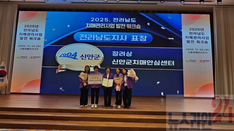 신안군 치매안심센터(보건소장 김현희)가 25일 고흥군에서 열린 ‘2025년 전라남도 치매관리사업 발전대회’에서 도내 22개 시·군 보건소 중 우수기관으로 선정돼 전라남도지사 기관표창을 수상했다.