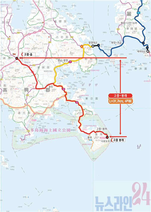 특히 ‘국도 15호선 고흥~봉래 4차로 확장공사’는 총길이 31.7㎞ 구간을 기존 2차로에서 4차로로 확장하는 사업으로, 총사업비 6,521억 원이 투입된다. 올해 1월 신속예타 선정 후 약 7개월간의 노력 끝에 8월 예비타당성 통과라는 결과를 이뤄냈었다.