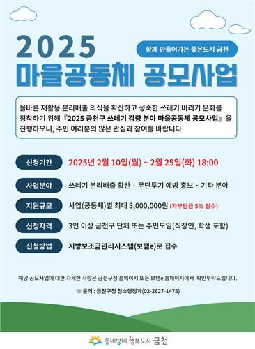 금천구(구청장 유성훈)는 오는 2월 25일까지 `2025 금천구 쓰레기 감량 분야 마을공동체 공모사업`에 참여할 단체를 모집한다고 밝혔다.