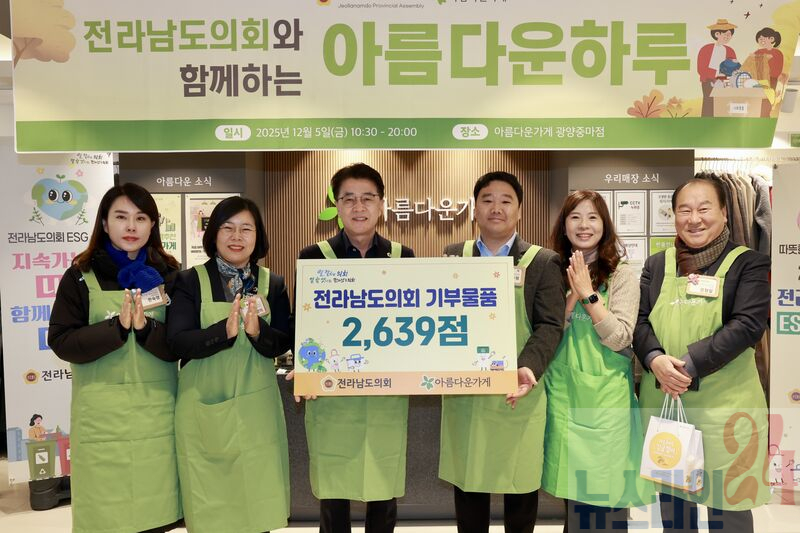 전라남도의회(의장 김태균)는 12월 5일 아름다운가게에서 ‘ESG 기부물품 전달식’을 열고, 의원과 직원들이 정성을 모아 기증한 자원순환 물품 2,639점을 전달했다.
