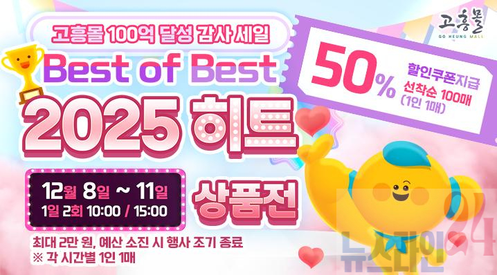 고흥군(군수 공영민)은 직영 온라인 농수축특산물 쇼핑몰 ‘고흥몰’이 누적 매출 100억 원 돌파를 기념해 오는 1월 8일부터 11일까지 ‘100억 달성 감사 세일–2025 Best of Best’ 기획전을 진행한다고 밝혔다.