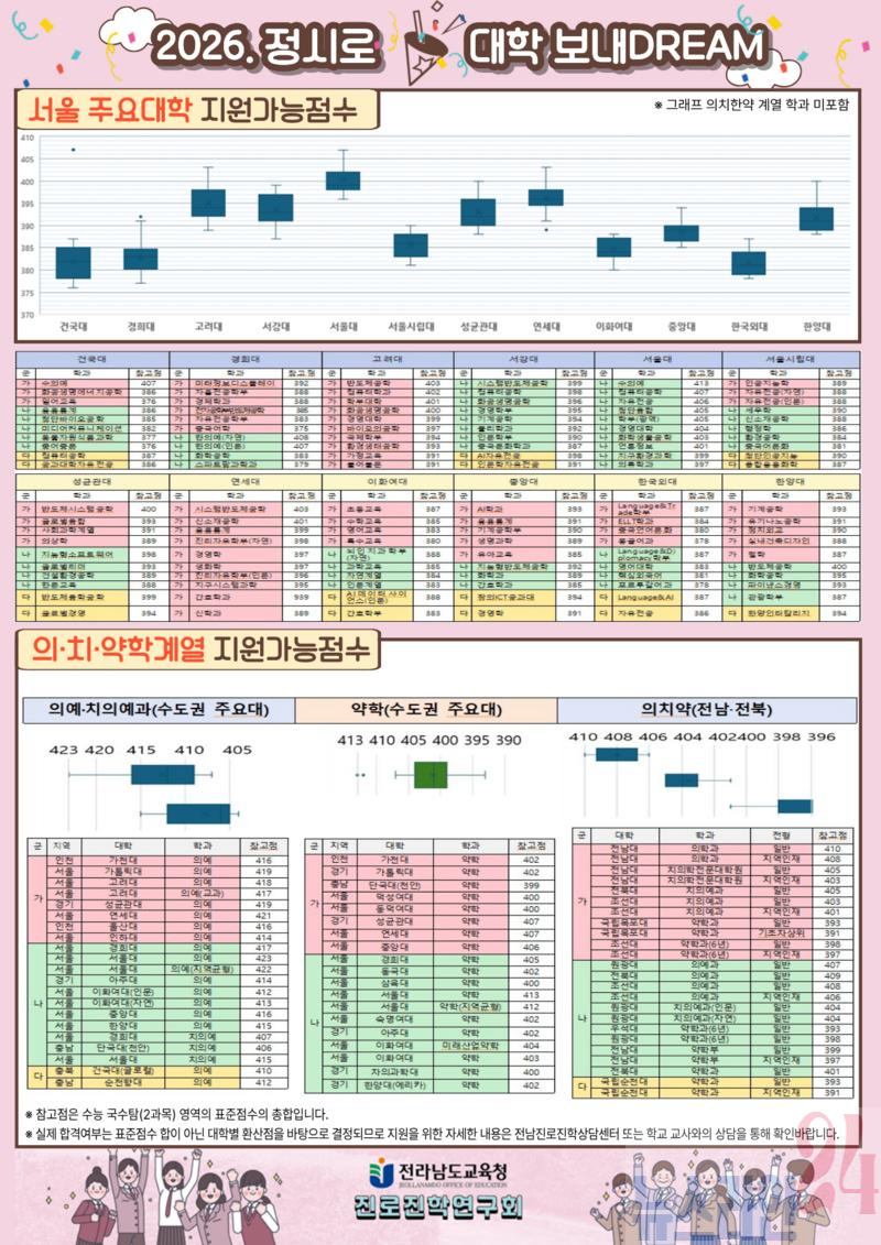이번 배치표에는 수도권과 전라권 의·치·약학계열, 서울 주요 대학, 전남대학의 지원 가능 점수가 함께 제시됐다.