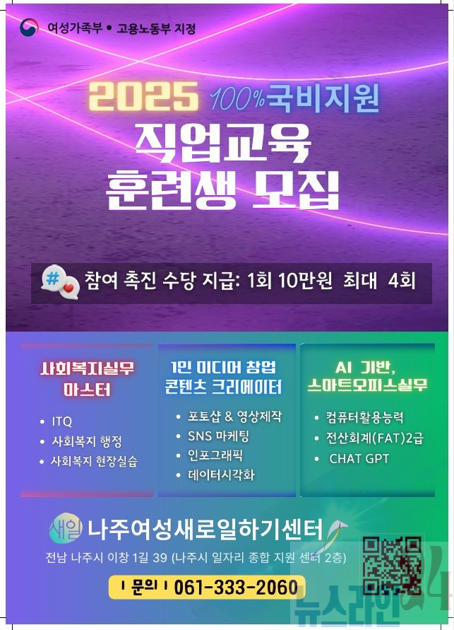 자세한 사항은 나주여성새로일하기센터(061-333-2060) 전화상담 및 방문 상담으로 문의하면 된다.