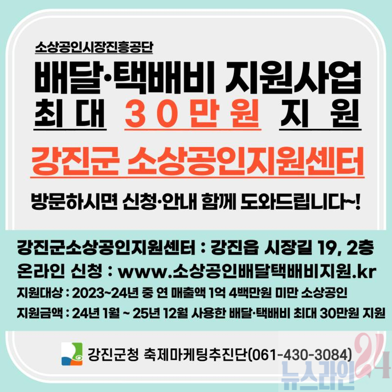 강진군소상공인지원센터, 배달·택배비 신청 도와드려요 1억 4백만원 이하 소상공인, 17일부터 신청 최대 30만원 지원받고 경영 부담 줄이세요