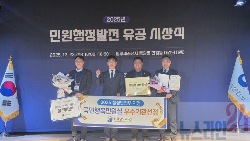 전라남도교육청은 23일 정부세종청사에서 열린 ‘국민행복민원실’ 재인증 시상식에서 행정안전부 장관 표창과 인증현판을 수여 받았다. 사진은 시상 후 기념사진 전라남도교육청은 12월 23일 정부세종청사 민원동 대강당에서 열린 ‘국민행복민원실’ 재인증 시상식에 민원업무 관계자들이 참석한 가운데, 행정안전부 장관 표창과 인증현판을 수여받았다.