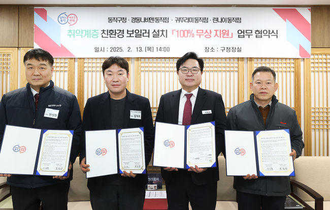구는 13일 동작구청에서 관내 보일러 시공업체 3곳과 ‘취약계층 친환경보일러 설치 100% 무상 지원 업무협약’을 맺었다고 14일 밝혔다.
