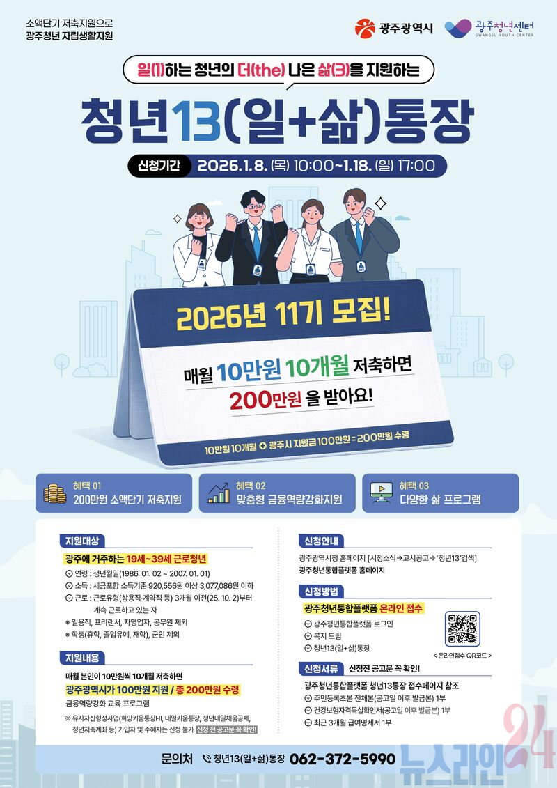 광주광역시(시장 강기정)는 일(1)하는 청년의 더 나은 삶(3)을 지원하는 ‘청년13(일+삶)통장’ 제11기 참여자를 8일부터 18일까지 모집한다.