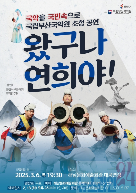 해남군은 국립부산국악원 <</span>왔구나 연희야!> 공연을 3월 6일(목) 저녁 7시 30분 문화예술회관 대공연장에서 개최한다.