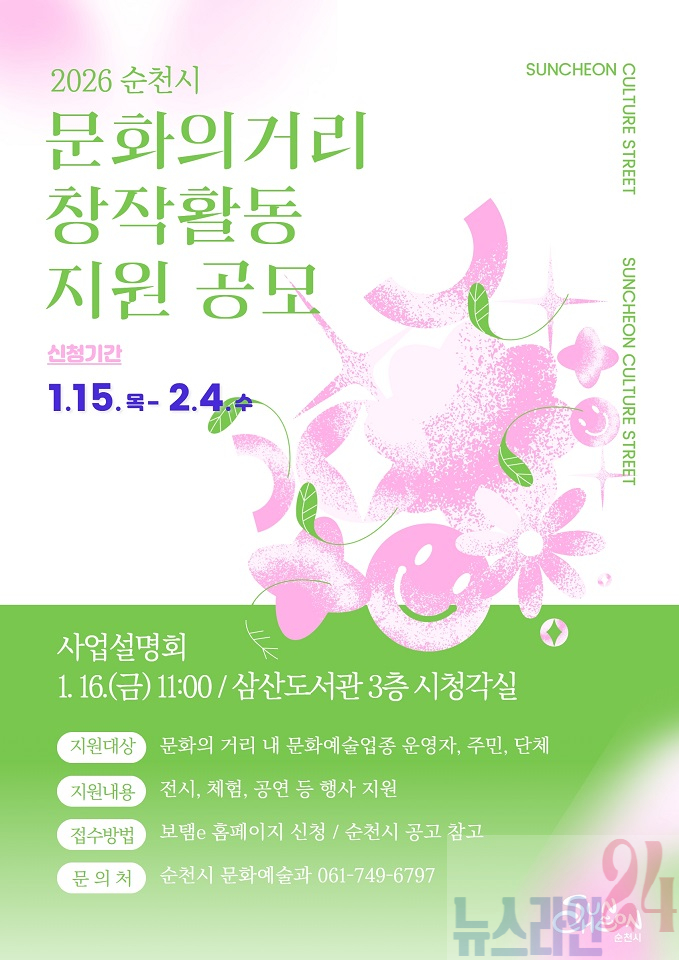 순천시는 문화의 거리를 예술특화 거점지역으로 육성하고 지역 예술인의 지속가능한 창작활동을 지원하기 위해 ‘2026년 순천시 문화의 거리 창작활동 지원사업’ 참여자를 공개 모집한다고 밝혔다.