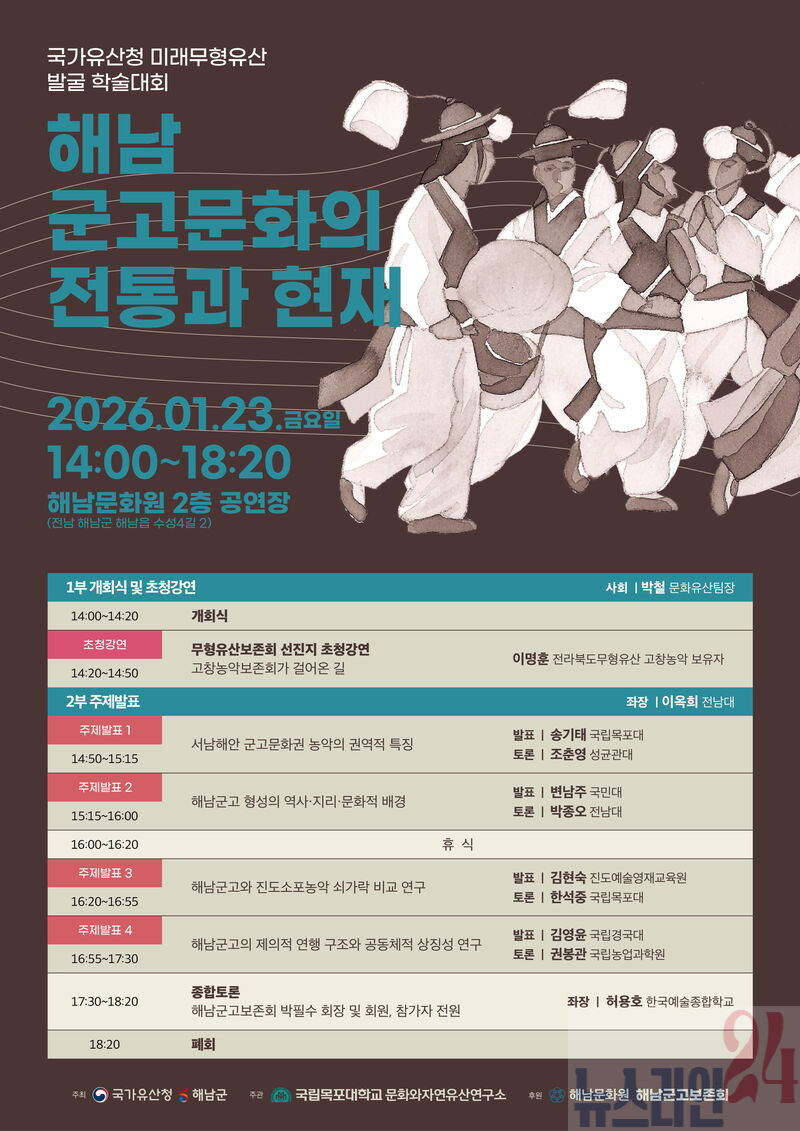 토론에서는 해남 군고문화의 가치와 의미를 공유하고, 미래 무형유산으로서의 보존과 계승 방안에 대하 자유롭게 의견을 나눌 예정이다. 군 관계자는“이번 학술대회가 해남 군고문화의 정체성을 재조명하고, 미래 무형유산으로서 체계적인 보존과 활용 방안을 모색하는 계기가 되길 바란다”고 전했다.