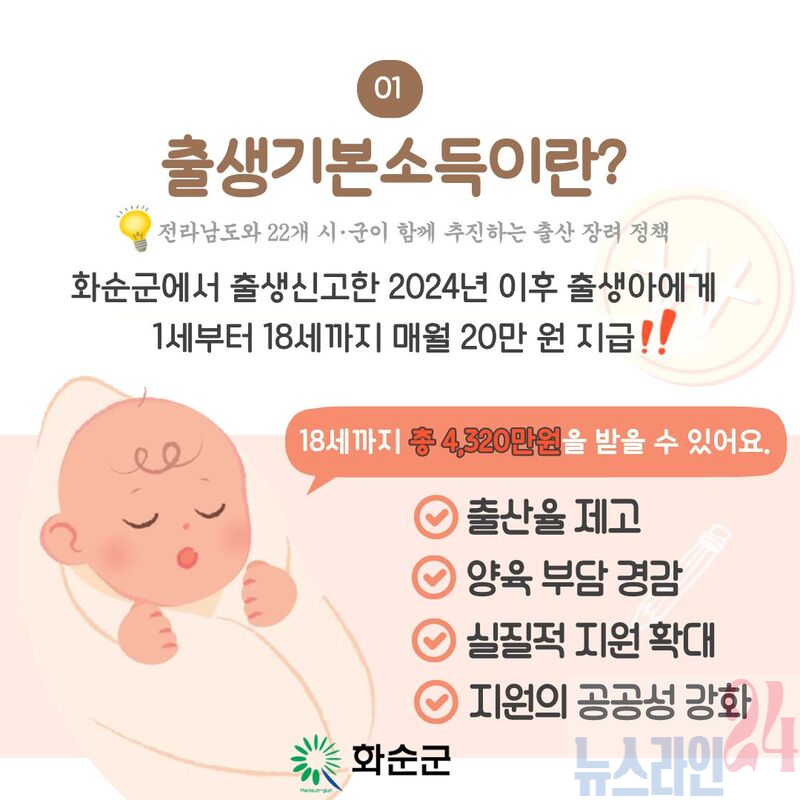 화순군(군수 구복규)은 20일 출산 장려와 양육 환경 개선을 위해 ‘출생기본소득 지원사업’의 신청 자격을 2026년부터 대폭 완화해 추진한다고 밝혔다.