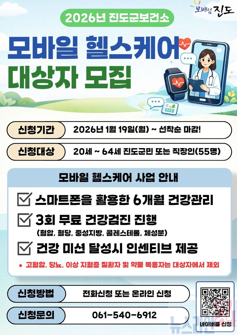 진도군은 지난 19일부터 군민들이 건강한 생활 습관을 형성할 수 있도록 ‘2026년 모바일 헬스케어 1기’ 대상자 55명을 선착순으로 모집하고 있다.