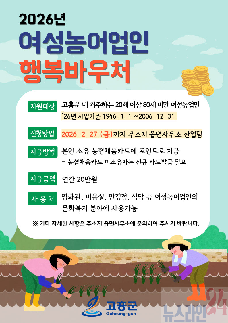 고흥군(군수 공영민)은 여성 농어업인의 문화·여가 활동을 돕기 위해 ‘2026년 여성농어업인 행복바우처 지원사업’ 신청을 오는 2월 27일까지 주소지 읍·면사무소에서 접수한다고 밝혔다.