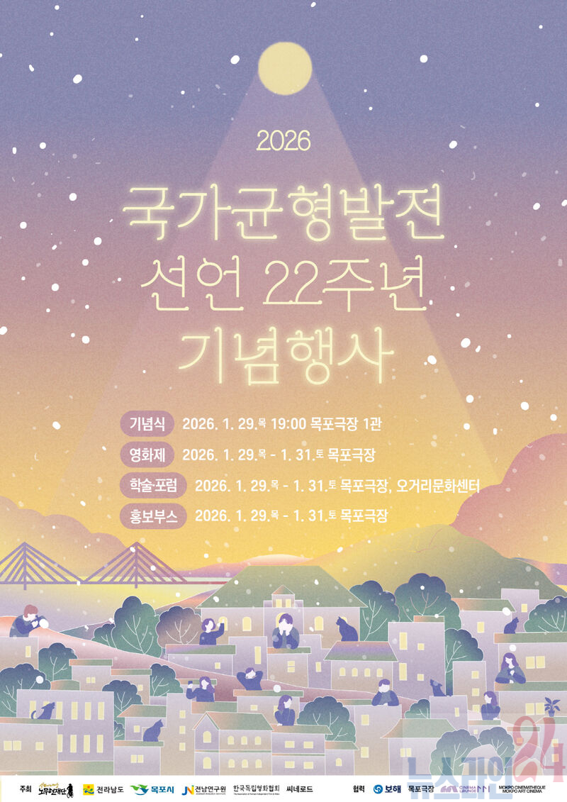 전라남도는 목포시, 노무현재단, 전남연구원, 한국독립영화협회와 함께 ‘국가균형발전선언 22주년 기념행사’를 29일부터 3일간 목포극장과 오거리문화센터에서 개최한다고 밝혔다.
