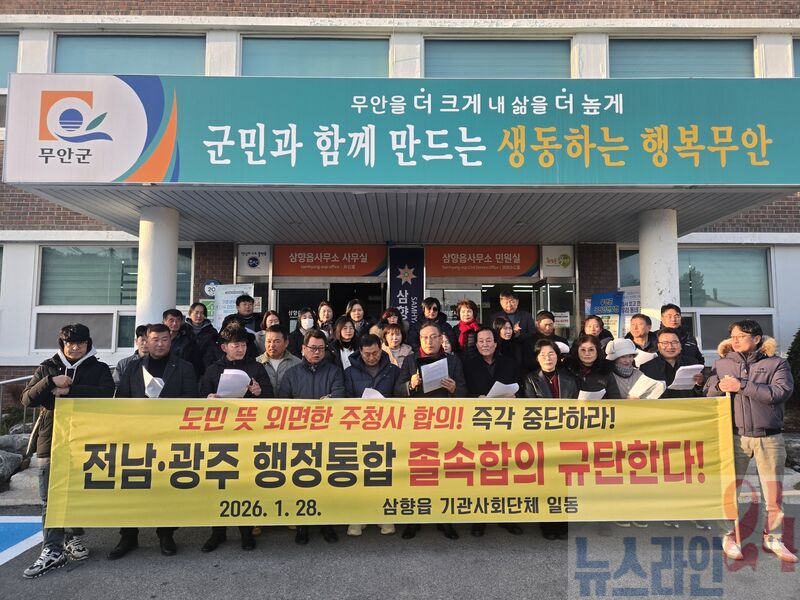 무안군 삼향읍, 일로읍 기관사회단체협의회는 최근 발표된 전남·광주 행정통합 관련 합의 내용에 대해 “깊은 유감을 넘어 강력한 분노를 표한다”며 주청사를 전라남도청이 위치한 무안으로 즉각 확정할 것을 촉구했다.