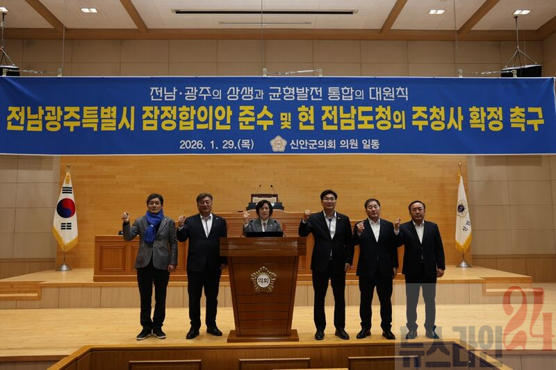 신안군의회(이상주 의장)는 최근 정치권과 정부차원에서 전남·광주 행정통합 논의가 본격화되는 가운데, 1월 29일 본회의장에서 전남·광주 행정통합과 관련해 전남광주특별시 잠정합의안 준수와 현 전라남도청의 주청사 확정을 촉구하는 결의문을 발표했다.
