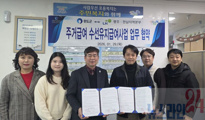 완도군, 주민 주거 지원 위해 LH 광주전남지역본부와 업무 협약 체결완도군은 지난 29일 LH(한국토지주택공사 광주전남지역본부)와 함께 주거 급여 수급자 가구의 주거비 부담을 덜어주기 위한 업무 협약을 체결했다.