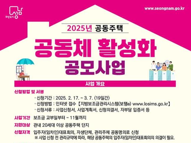 성남시(시장 신상진)는 20세대 이상의 공동주택 단지를 대상으로 3월 7일까지 `2025년도 공동체 활성화 사업`을 공모한다.