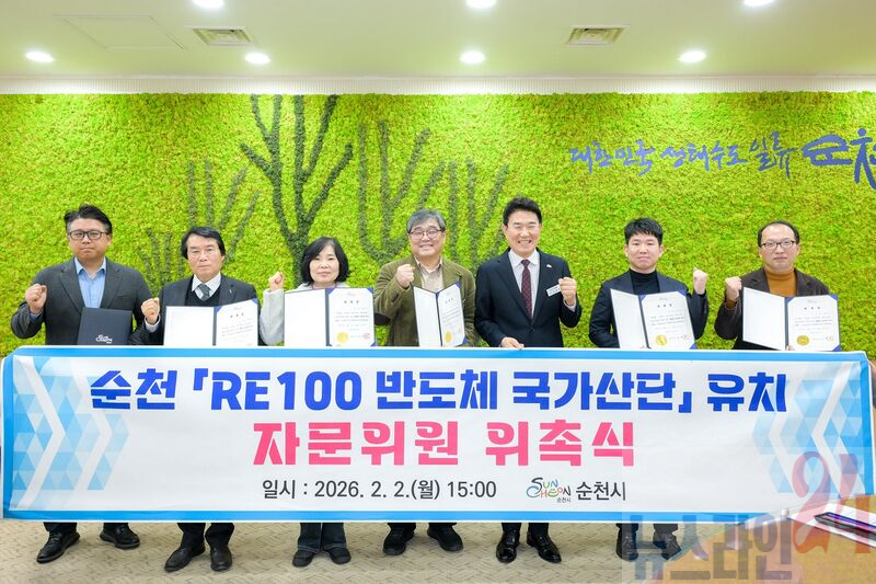 지난 2일 노관규 순천시장이 RE100 반도체 국가산단 유치를 위한 자문위원을 위촉하고 위원들과 기념촬영을 하고 있다순천시가 지난 2일 RE100 반도체 국가산단 유치를 위해 분야별 전문성을 갖춘 자문위원 8명을 위촉하고, 육성 전략 고도화 및 유치 활동에 더욱 박차를 가한다.