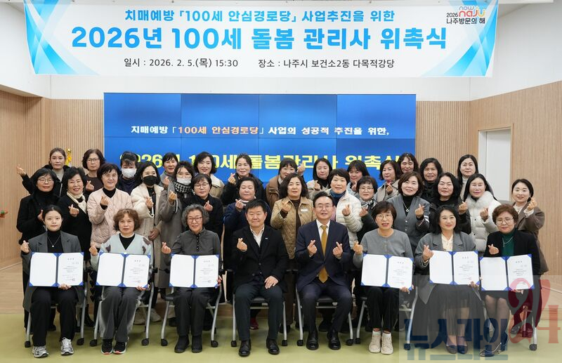 나주시는 올해 1월 공개 모집을 통해 노인 돌봄과 복지 관련 자격을 갖춘 총 40명(재위촉 33명, 신규 7명)의 ‘100세 돌봄관리사’를 선발하고 지난 5일 나주시보건소 다목적 강당에서 위촉식을 개최했다고 6일 밝혔다.