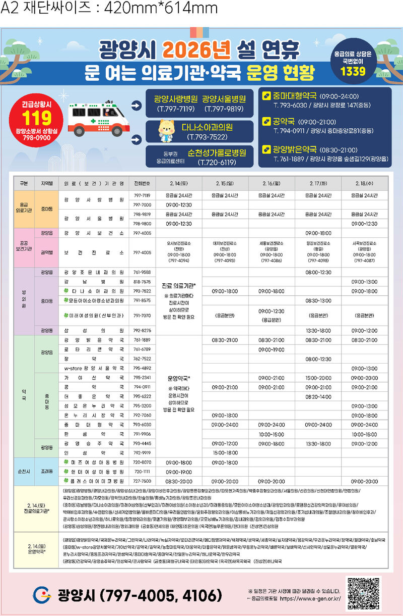 연휴 동안 지역 응급의료기관인 ▲광양사랑병원 ▲광양서울병원 등 2개소는 응급실을 24시간 비상체제로 운영하며, 관내 병·의원 105개소, 보건의료기관 6개소, 휴일지킴이 약국 46개소가 문을 열어 의료 서비스를 제공한다.
