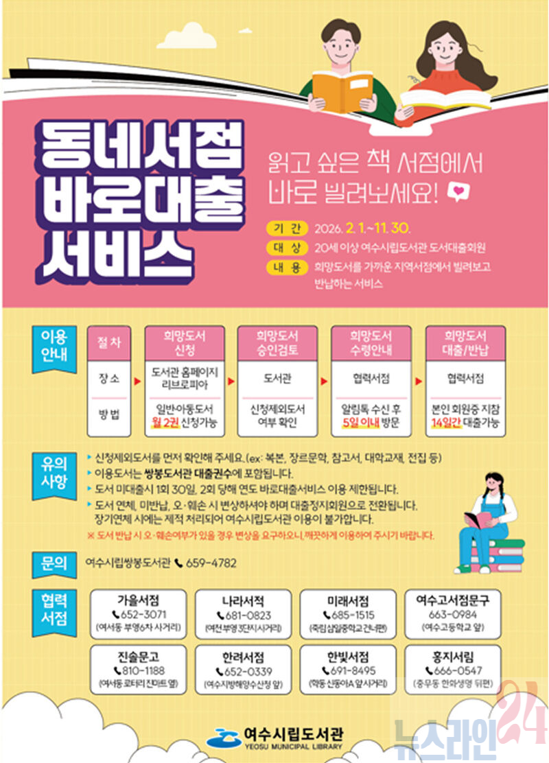 여수시는 시민들의 독서 접근성을 높이고 지역 서점과 상생을 도모하기 위해 ‘동네서점바로대출서비스’를 2월 1일부터 운영한다고 밝혔다.