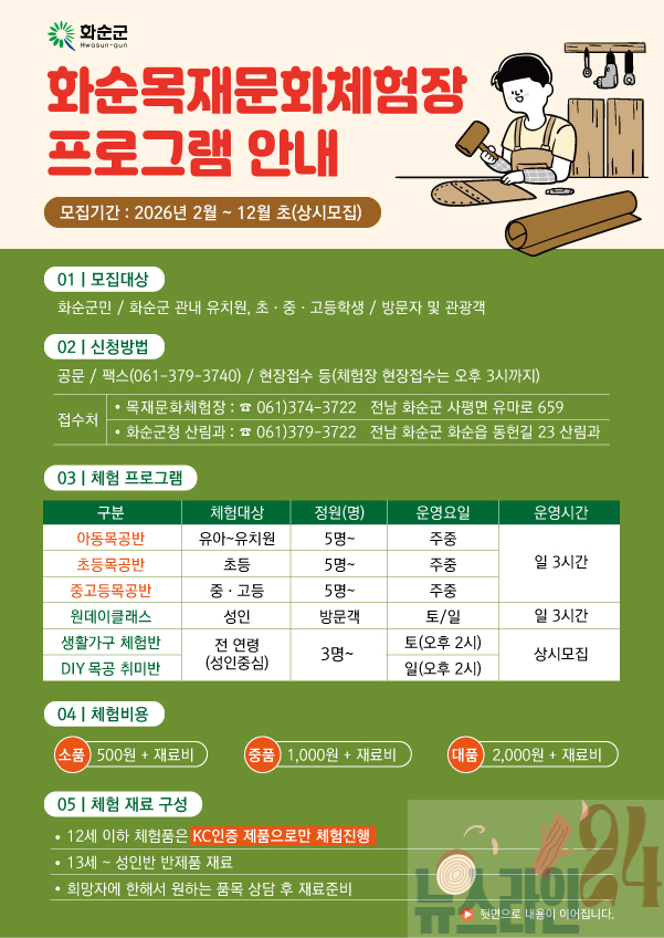 또한, 관내 보육시설과 학교 등을 대상으로 ‘찾아가는 방문 수업”을 병행해 보다 많은 군민이 목재 문화 체험 기회를 누릴 수 있도록 할 계획이다.