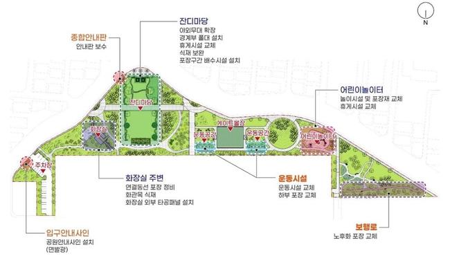 주요 정비 내용은 잔디마당, 운동 공간, 어린이놀이터, 도보길 포장 등이다.