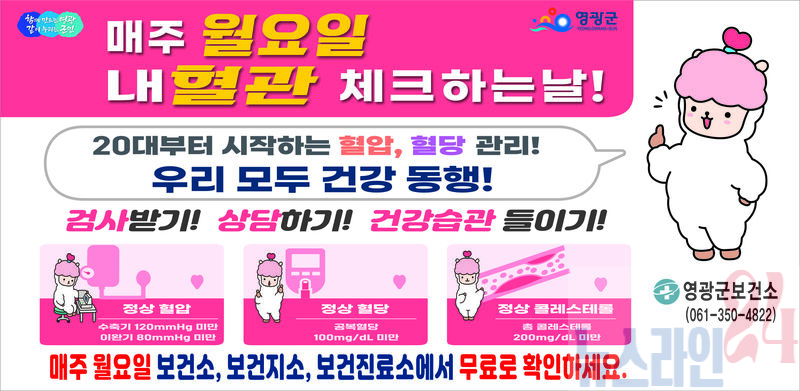 영광군은 심뇌혈관질환 예방을 위해 매주 월요일을‘혈관 건강 체크하는 날’로 지정해 오는 2월 23일부터 본격 추진한다고 밝혔다.