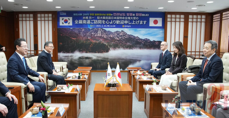 김영록 전라남도지사가 20일 도청 접견실에서 전남도청을 내방한 미즈시마 고이치 주한일본대사와 전남도-일본의 우호교류 협력을 위한 논의를 하고 있다.