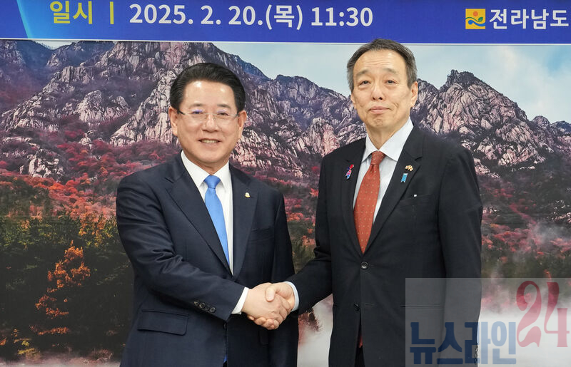 김영록 전라남도지사가 20일 도청 접견실에서 전남도청을 내방한 미즈시마 고이치 주한일본대사와 기념촬영을 하고 있다.