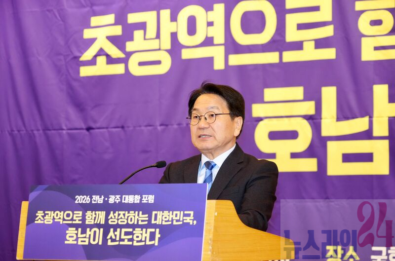 강기정 광주광역시장이 19일 서울 국회도서관 대강당에서 열린 '2026 전남·광주 대통합 포럼'에 참석해 환영사를 하고 있다. [광주광역시 제공] 광주광역시(시장 강기정)는 전라남도와 함께 19일 오후 서울 국회도서관 대강당에서 ‘초광역으로 함께 성장하는 대한민국, 호남이 선도한다’를 주제로 ‘2026 전남·광주 대통합 포럼’을 개최했다.