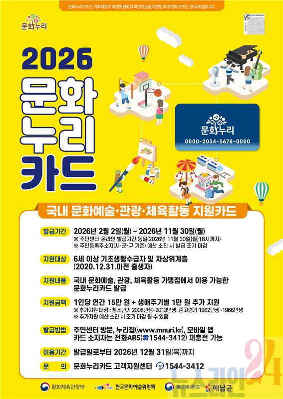 해남군은 문화 소외계층의 문화 향유 기회를 넓히기 위해‘2026년도 통합문화이용권(문화누리카드) 사업’을 본격 추진한다.
