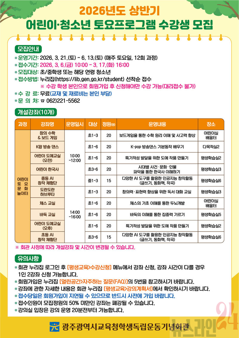 어린이·청소년 토요프로그램은 ▲어린이 한국사 ▲창의수학&보드게임 ▲AI창작 체험단 등 10개가 개설돼 오는 3월 21일부터 6월 13일까지 매주 토요일 2시간씩 총 12회 진행된다.