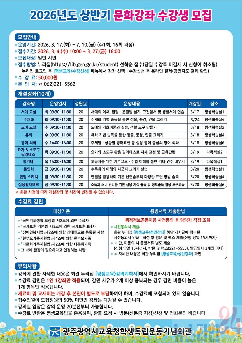 광주시교육청학생독립운동기념회관(이하 광주학생독립운동기념회관)은 ‘2026년도 상반기 평생교육 프로그램’ 수강자를 모집한다.