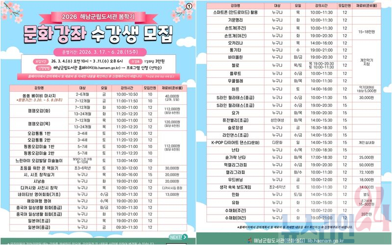 수강신청은 2026년 3월 4일부터 3월 11일까지 해남군립도서관 누리집을 통해 온라인 접수로 진행된다.
