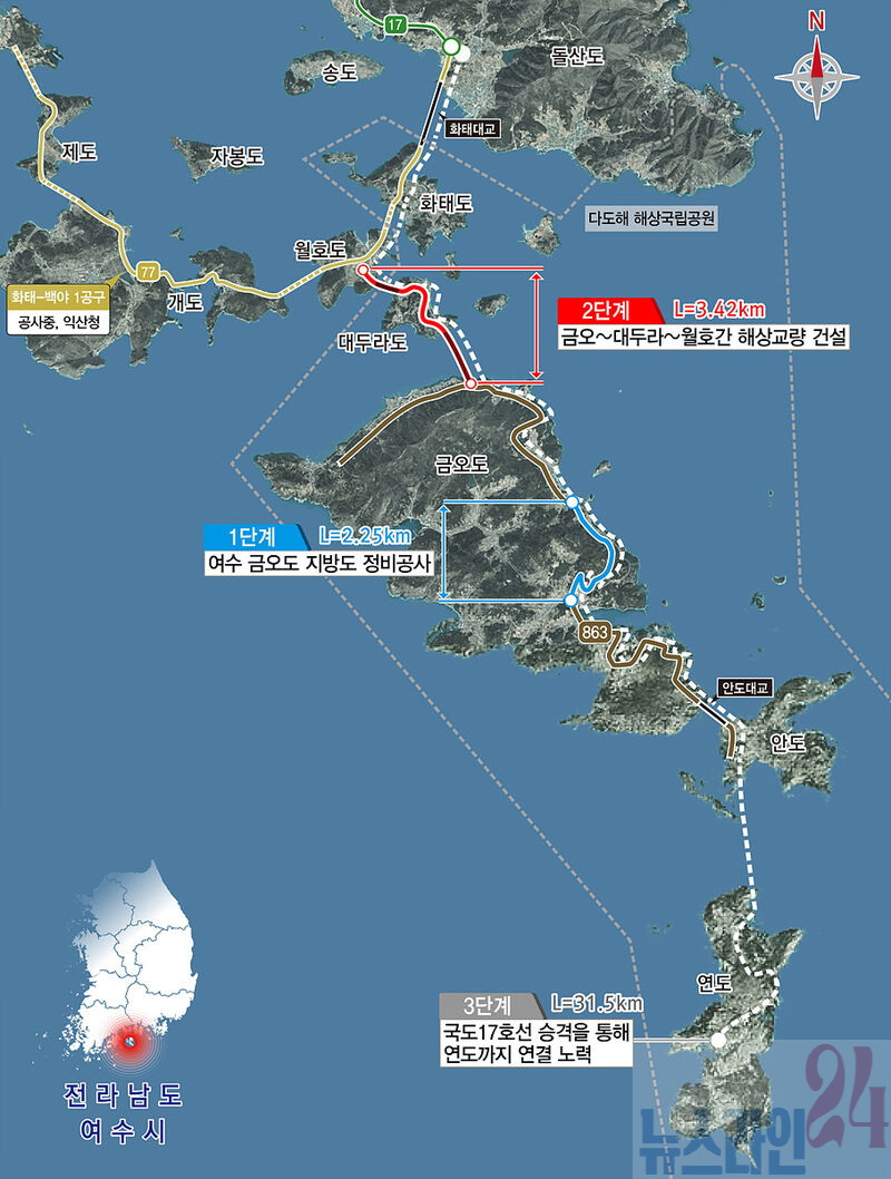 금오도 지방도 정비공사는 총 3단계로 추진된다. 1단계 금오도 내 기존 도로포장 정비(’26년, L=2.25㎞), 2단계 월호도~대두라도~금오도 구간 해상교량건설(’27~’33년, L=3.42㎞), 3단계는 지방도 863호선을 국도 17호선으로 승격하여 연도까지 연결하는 공사로 현재는 구상단계에 있다.