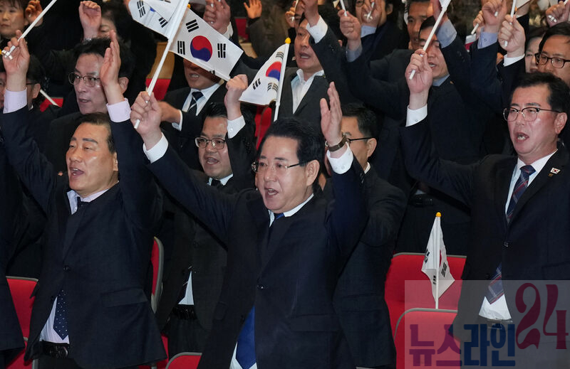 김영록 전라남도지사가 1일 전남도청 김대중강당에서 열린 ‘제107주년 3·1절 기념식’에서 참석자들과 만세 삼창을 하고 있다.