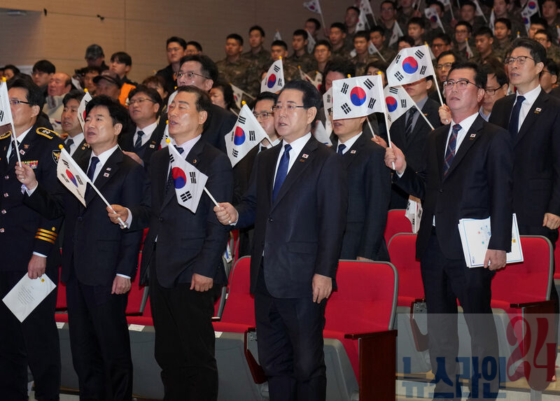 김영록 전라남도지사가 1일 전남도청 김대중강당에서 열린 ‘제107주년 3·1절 기념식’에서 참석자들과 삼일절 노래를 부르고 있다.
