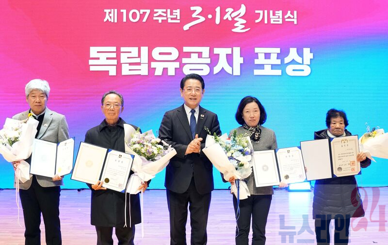 김영록 전라남도지사가 1일 전남도청 김대중강당에서 열린 ‘제107주년 3·1절 기념식’에서 유공자들에게 표창을 수여한 뒤 기념촬영을 하고 있다.