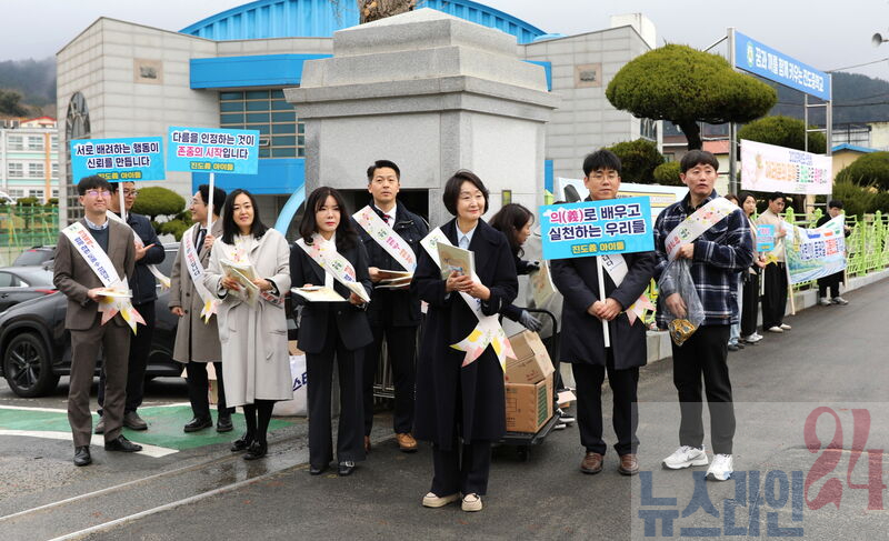 이날 행사에는 하숙자 교육장을 비롯해 교육지원청 관계자, 진도군청, 진도경찰서, 진도중학교 교직원, 학부모회와 진도중 학생자치회 학생 등이 참여해 등교하는 학생들에게 인사와 응원의 메시지를 전했다. 참가자들은 ‘서로 배려하는 행동이 신뢰를 만듭니다’, ‘다름을 인정하는 것이 존중의 시작입니다’라는 문구가 적힌 피켓 등을 활용하여 캠페인 활동을 펼쳤다.