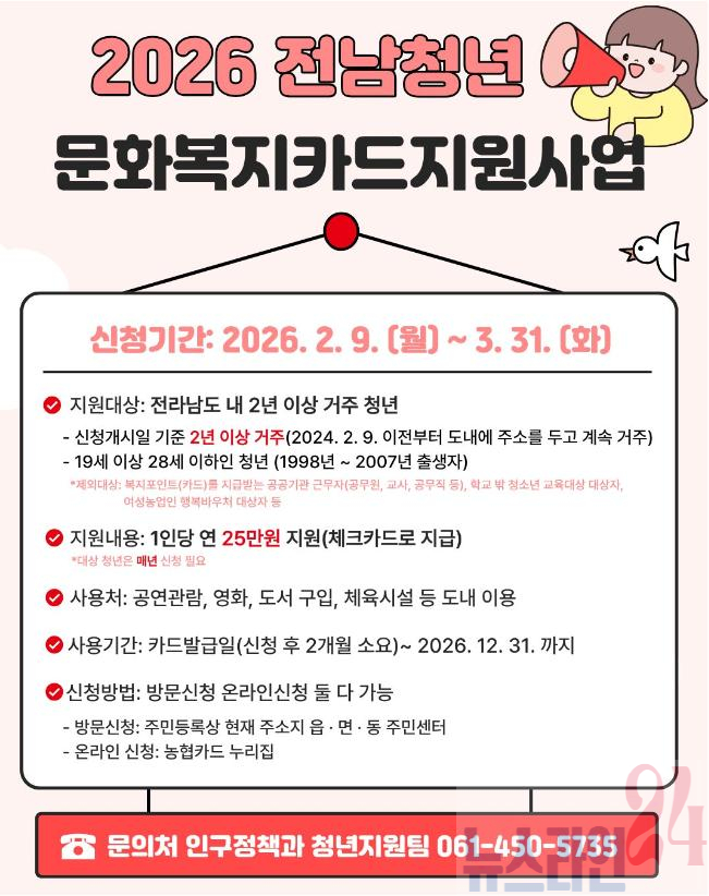 무안군(군수 김산)은 청년의 문화생활과 자기계발을 지원하기 위해 ‘2026년 전남 청년 문화복지카드 지원사업’ 대상자를 모집하고 있다고 밝혔다.
