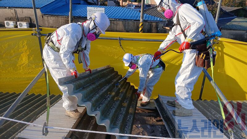 슬레이트 철거 공사가 진행 중인 모습강진군이 1급 발암물질인 석면으로부터 군민의 건강을 보호하고 쾌적한 주거환경을 조성하기 위해 ‘2026년 슬레이트 처리 지원사업’을 실시한다.