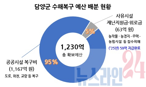 담양군이 확보한 복구비 1,230억 원은 크게 ‘공공시설 복구비(1,167억 원)’와 ‘사유시설 재난지원금·위로금(63억 원)’으로 나뉜다.