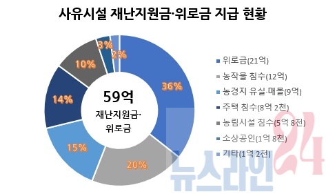 주요 지급 내역은 ▲위로금 21억 ▲농작물 침수 피해 12억 ▲농경지 유실·매몰 9억 ▲주택 침수 8억 2천 ▲농림시설 침수 5억 8천만 ▲소상공인 1억 8천만 원 등이다.