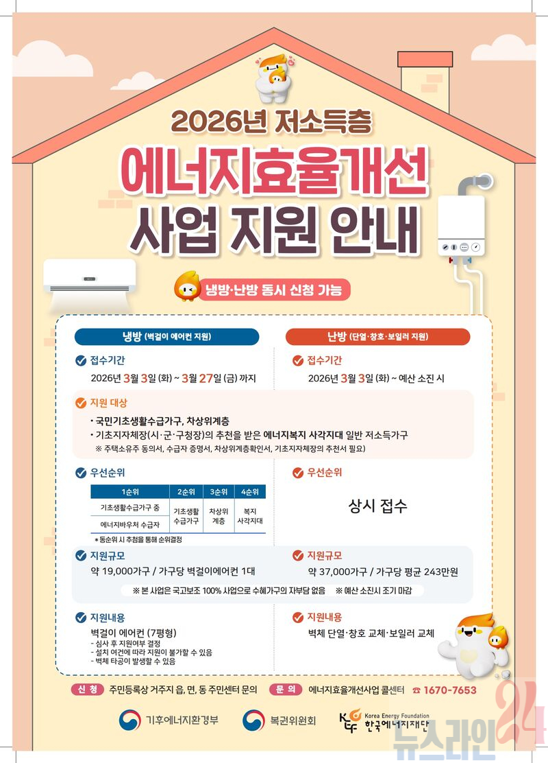 지원 대상은 국민기초생활수급가구와 차상위계층 등 에너지 취약계층이며, 복지 사각지대에 놓인 저소득가구도 지자체 추천을 통해 신청할 수 있다.