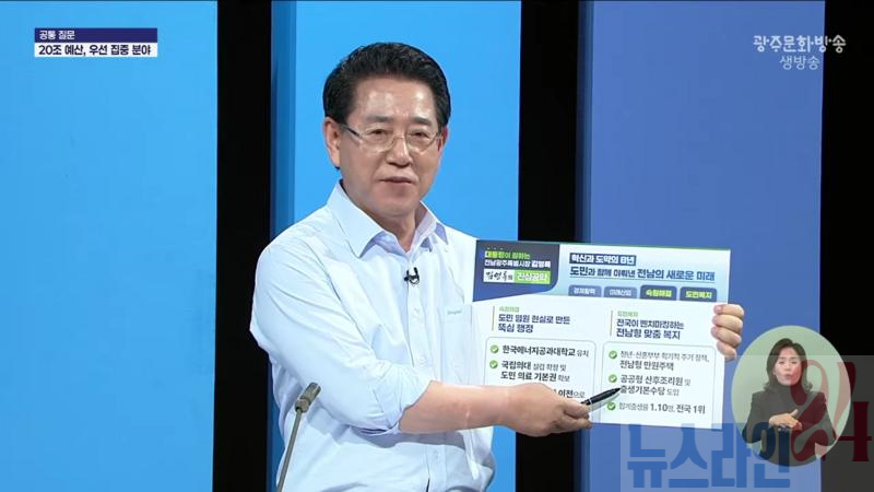 그는 공통질문인 ‘1호 공약’으로, 500조원 투자 유치를 통한 광주와 전남 동·서부권 ‘전주기(풀 사이클) 반도체 생태계’ 구축을 내세웠다. 이를 통해 2035년까지 좋은 일자리 10만 개를 만들어, 인구 400만의 전남광주특별시 대부흥의 역사를 써나가겠다는 구상도 덧붙였다.